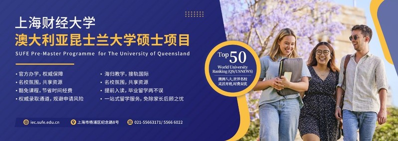 上海财经大学-澳大利亚昆士兰大学国际硕士留学项目是一个极具口碑、培养卓越人才的硕士留学项目。该项目依托上海财经大学优质教学资源和先进的国际化办学理念,以其合理的时间规划和科学的课程安排,为国内大学生提供了优质的升学路径和进入昆士兰大学攻读硕士的有利条件。该项目以“灵活开班,时费双优”为特色。学生进入上海财经大学国际教育学院学习商科类基础课程,所修课程成绩合格同时可豁免昆士兰大学的部分学分,以此缩短国外学习周期,获得时间与经费的大幅节省。在满足昆士兰大学语言要求并且通过国内项目考核后,可在本科毕业取得学士学位后直接以自费留学的方式进入昆士兰大学学习,完成所有硕士课程,可获得昆士兰大学授予的硕士学位,并且可按照中国(教育部)留学服务中心的相关政策申请认证。