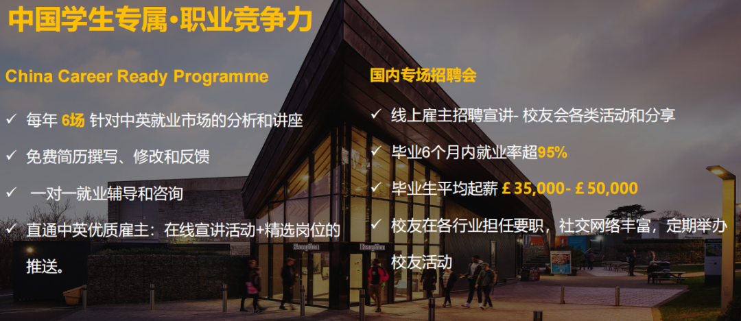埃克塞特大学特别为中国学子提供定制化中英就业支持,该体系涵盖中英就业市场深度分析、行业前沿讲座及一对一职业咨询。同时,学校充分依托强大的校友网络,为毕业生提供宝贵的内推机会与职场经验分享,全方位助力学子在中英两地开启职业生涯。