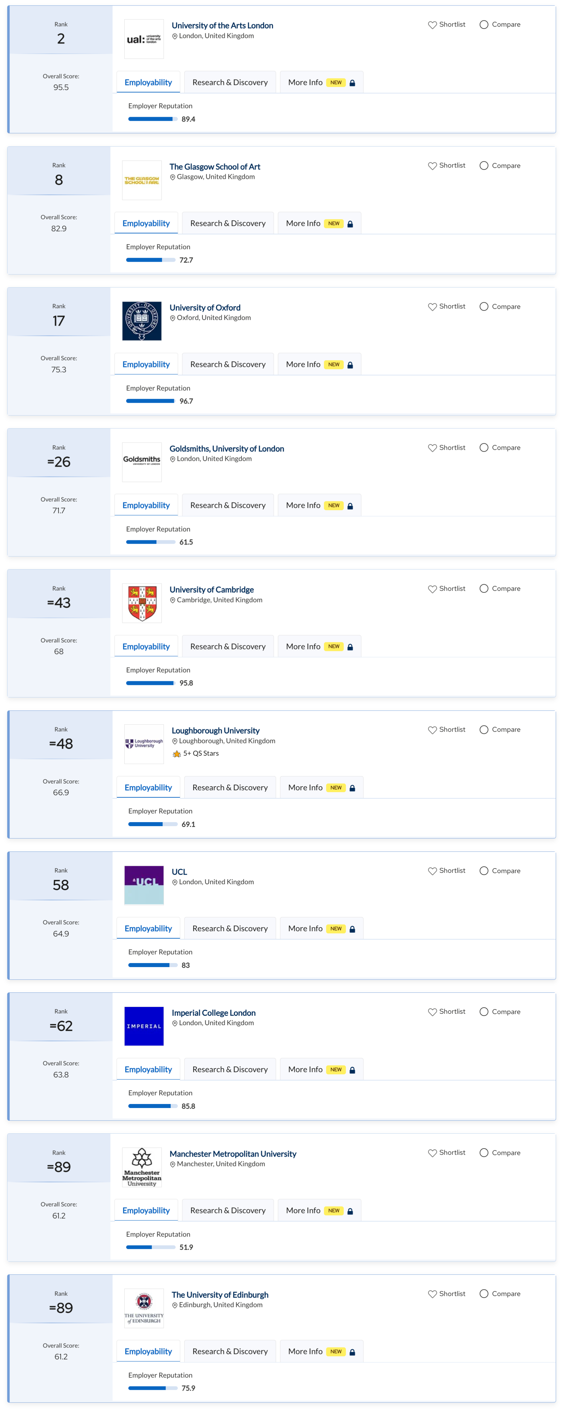 雇主声誉分89.4,这意味着当你拿着UAL的本科学历去面试,全球创意行业的HR认得这个名字,并且高看一眼。